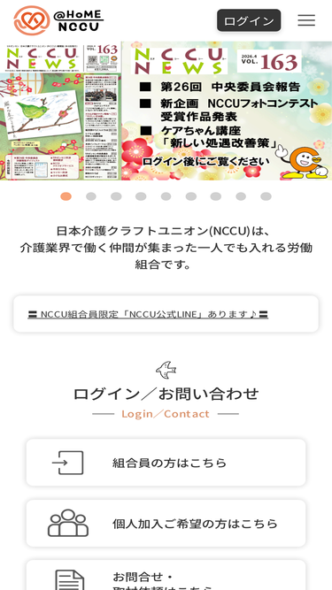 76%組合員の皆さんとNCCUをつなぐ新しいツールができました!「組合からの祝い金や見舞金って、何があったっけ?」「職場の悩みごとや労働相談は、どこに連絡すればいい?」──そんなときに役立つのが「NCCU公式LINE」です。 「友だち追加」をしておけば、組合のさまざまな情報にLINEから即アクセスできます。また、機関誌やホームページにも載らないタイムリーなメッセージも随時お届けします。 NCCU公式LINE「友だち追加」はこちらから <要ログイン> ※ NCCU公式LINEは日本介護クラフトユニオン(NCCU)組合員限定のサービスです。 ■「ホームページにログインできない」などのお問い合わせはこちら 総合フリーダイヤル 0120-519-931(平日9:30~17:00)