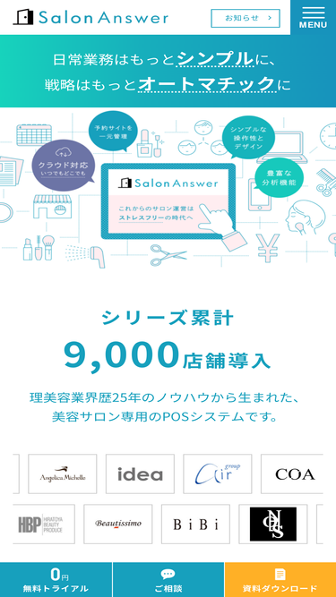 81%サロンアンサーの紹介ページです。サロンアンサーは、美容サロン専用の予約・売上管理システム。予約・売上管理、レジ機能はもちろん、サロン運営に必要なデータ分析集計機能を搭載。クラウド対応型で、インターネット環境があれば簡単にお店の情報を確認できます。使いやすい画面でサロンの成長をサポートします。
