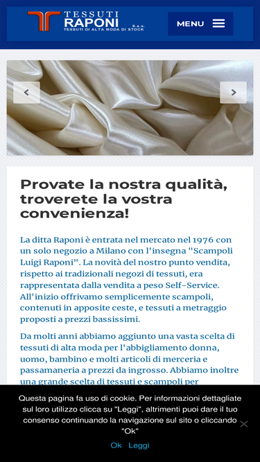 95%Provate la nostra qualità,troverete la vostra convenienza La nostra caratteristica principale è il vasto assortimento di tessuti a peso. Scampoli di ogni genere: cotoni per donna, uomo, bambino, teli per sfondi o coreografie e arredo casa, tagli per camicie in viscosa, in seta e microfibra, panno lenci e feltro, tende, tendine a pannello, fodere e