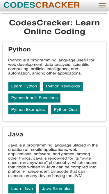 96%hey, welcome to codescracker.com, where you can learn computer programming languages such as java, c, c++, python, html, css and others.