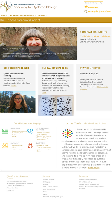 94%this project works to preserve donella (dana) h. meadows’s legacy as an inspiring leader, scholar, writer, and teacher. we aim to maintain an easily accessible archive of dana’s work online.