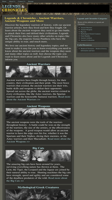 27%legends and chronicles has information on ancient warriors, ancient weapons, the big cats, mythological greek creatures and much more. whether you want to know about the ancient aztec warriors or the might spartan warriors, legends and chronicles is bringing ancient history back to life.