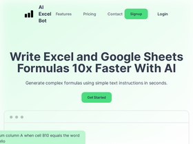 53%AI Excel Bot helps you create complex Excel formulas in seconds. Use simple English prompts to generate formulas. AI Excel Bot's formula generator uses state of the art GPT-3 AI model to give you the best results.
