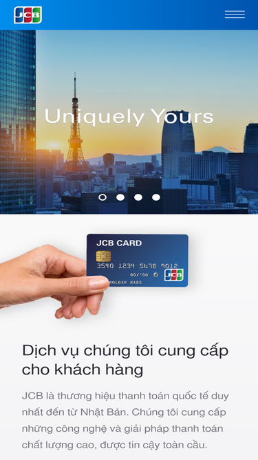 93%Đây là trang web chính thức của JCB, thương hiệu thẻ thanh toán quốc tế duy nhất đến từ Nhật Bản. Tại đây chúng tôi cung cấp nhiều thông tin và dịch vụ hữu ích dành cho chủ thẻ JCB và đối tác JCB.