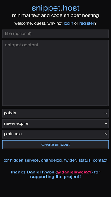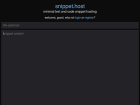 62%minimal text and code snippet hosting. ultra-fast, free, easy to use, with syntax highlighting and private snippets. registration not required. try it now.