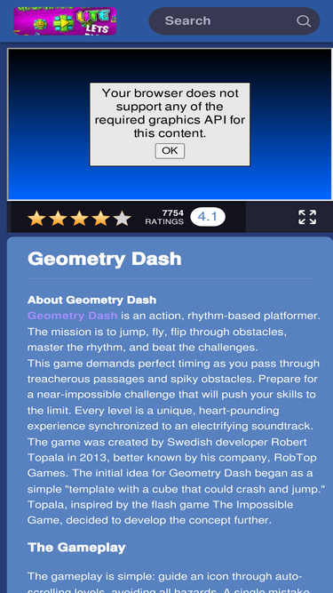 94%geometry dash is an addictive rhythm-based platformer with thrilling challenges, unique levels, high scores, achievements, and more. jump, fly, and flip through dangerous obstacles and push your skills to the limit. play on your pc, mac or mobile device!