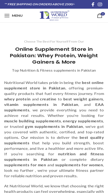 65%Discover Nutritional World – Your Trusted Online Supplement Store in Pakistan. We offer best Whey Protein Price in Pakistan to elevate your fitness journey.