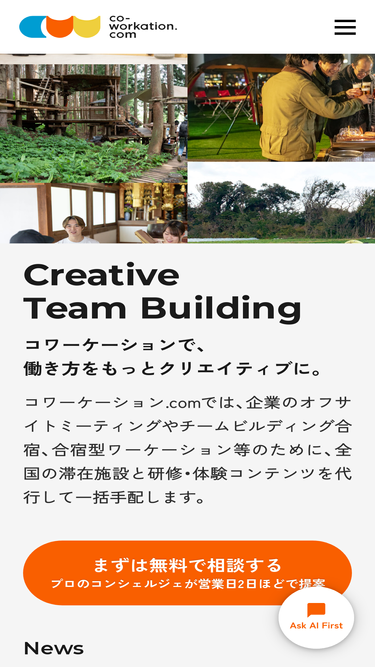 法人の経営合宿やチームビルディング合宿、オフサイトミーティングのために、全国の施設と研修・体験コンテンツを代行して一括手配。プランニングから全面サポートするコンシェルジュ型で現状の課題やご希望から最適なコワーケーション体験をご提案。