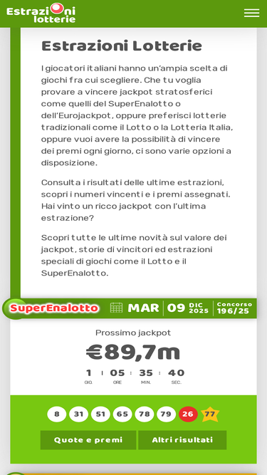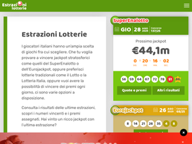 87%estrazioni delle lotterie italiane più popolari come lotto, superenalotto, 10elotto, vincicasa, eurojackpot ecc. informazioni, notizie e molto altro.