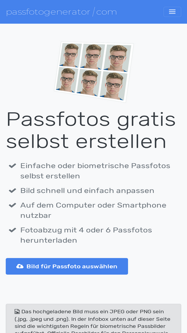 100%mit dem passfoto-generator lassen sich einfache & biometrische passbilder in drei schritten selbst erstellen und zum ausdrucken herunterladen. jetzt testen!