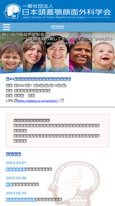 88%頭や顔などの病気、変形に対する手術を進歩させるための学会です。医療者だけでなく一般の方への分かりやすい情報も提供しています。対象とする疾患には、頭蓋骨縫合早期癒合症、唇裂・口蓋裂、生まれつきの顎の変形、顎変形症、耳の変形、顔面骨骨折、顔面の腫瘍・血管腫、頭蓋・顔面の組織欠損、顔の輪郭形成、頭頸部の再建術、眼瞼下垂症、顔のケガ・傷跡、顔面神経麻痺、鼻の変形、耳下腺腫瘍などがあります。