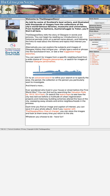 89%theglasgowstory tells the story of glasgow in words and pictures, told by some of scotland's best writers, and illustrated with thousands of images from the collections of the city's world-famous libraries, museums and universities. from football to fashions, auchenshuggle to yoker, you'll find it all here.