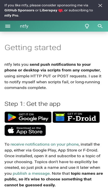 ntfy lets you send push notifications via scripts from any computer or phone. Made with ❤ by Philipp C. Heckel, Apache License 2.0, source at https://heckel.io/ntfy.