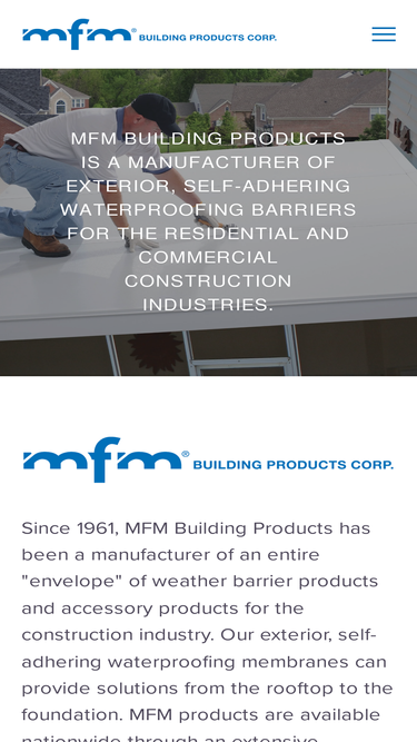 100%MFM Building Products is a manufacturer of exterior, waterproofing membranes such as low slope roofing membranes, roofing underlayments, window flashing tapes, waterproofing membranes and accessory products for the construction industry.