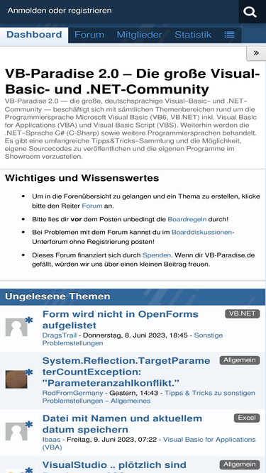 92%vb-paradise ist eine große, deutschsprachige community, die alle themen rund um die programmiersprache visual basic (vb6, vb.net, vba, vbs) und die .net–sprache c# abdeckt. inkl. tipps–bereich, sourcecode–austausch und showroom für eigene programme.