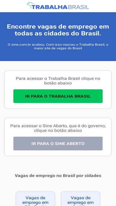 80%o sine agora é trabalha brasil! nossa missão é levar vagas de emprego grátis para todas as pessoas em busca de trabalho no brasil. cadastre seu currículo e procure as melhores vagas.