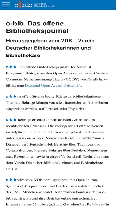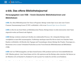 o-bib. das offene bibliotheksjournal: der name ist programm. beiträge werden open access unter einer creative commons namensnennung-lizenz (cc by) veröffentlicht. o-bib ist offen für eine breite palette an bibliothekarischen themen.