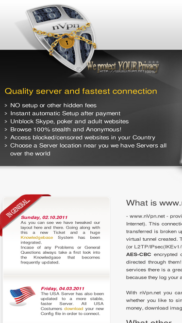 nvpn.net - 100% safe | no logs | vpn service | openvpn, squid & socks5 proxy, l2tp/ipsec(ikev1 & ikev2), portforward | reliable | affordable | anonymous | since 2010 ->