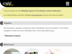 98%creisi productions ist eine webdesign-firma in ennetbürgen. ich gestalte ihre website und biete vielfältige dienstleistungen rund um ihren internet-auftritt. creisi productions, ch-ennetbürgen, tel. 076 586 89 39