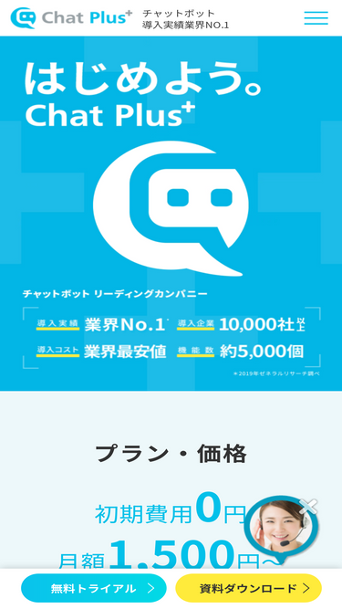 97%チャットボット導入実績業界No.1のチャットプラスは、月額1,500円で運用可能な多機能型チャットサポートツール!ユーザーの自己解決を促進する最先端AIを活用したFAQシステムのFAQプラスは初期費用0円!