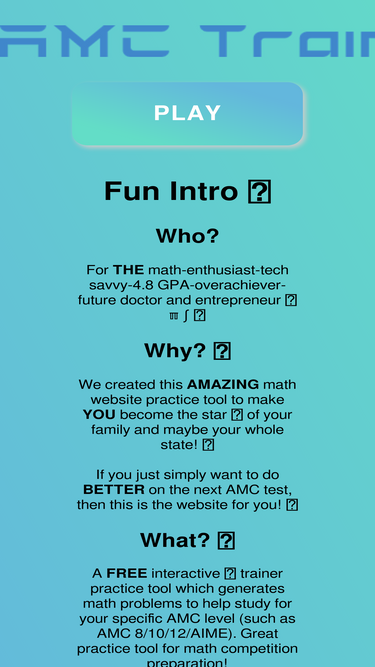 A FREE interactive 👆 trainer practice tool which generates math problems for your specific AMC level 📈 (such as AMC 8/10/12/AIME). Great tool for math competition preparation, study, and training!
