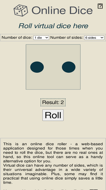 79%Roll virtual dice with our free random dice simulator - (d4, d6, d8, d10, d12, d20) - For anyone who doesn't have real-life dice available.