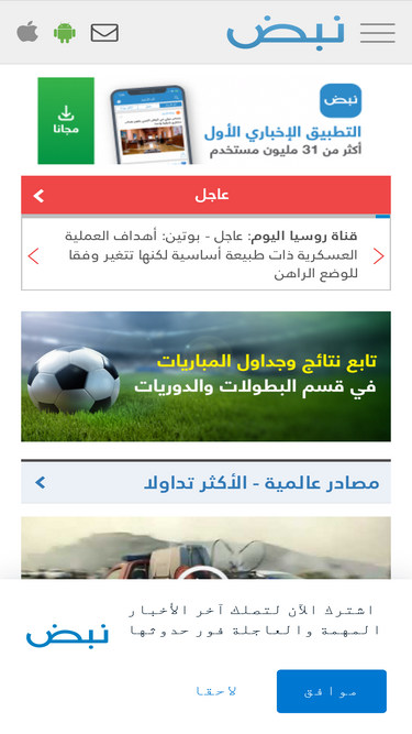 65%كن أول من يعلم اخبار اليوم والأخبار العاجلة مع تطبيق "نبض" - أول تطبيق مجاني يقدم لك آخر الأخبار من مصادرك المختارة، كالأخبار المحلية والعالمية والسياسية والرياضية والتقنية والنسائية