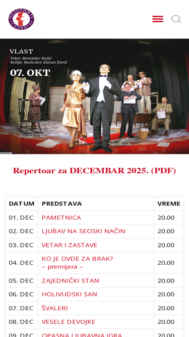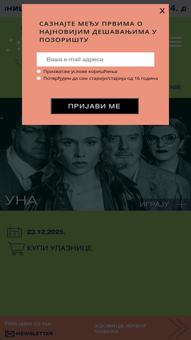 82%Следеће на репертоару Цео репертоар Купите улазнице Позориште на Теразијама Вести Све вести Билтен Уколико желите да Вам редовно шаљемо репертоар на