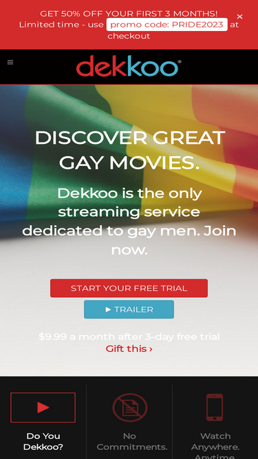 Explore a world of queer male perspectives with Dekkoo. It’s a curated global tour of gay cinema you can enjoy from home—beautiful, bold, and always ad-free. Begin your free trial today.