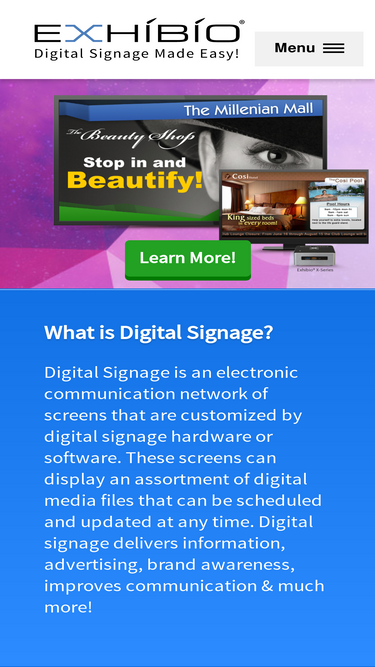 88%exhibio's easy, comprehensive, and affordable digital signage solution displays your content on lcd, plasma, or other displays using an easy web interface.