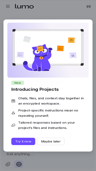 85%Meet Lumo, the zero-access encrypted AI assistant by Proton that does not track or record your conversations. Ask me anything — it's confidential