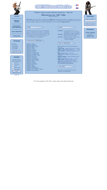 96%toutes les tabs (tablature, partition, tab) de guitare au format 'guitar pro'. le format 'guitar pro' permet d'obtenir une tablature exacte du morceau. 1001 tabs permet également de trouver les différents accords de guitare.par exemple, tablatures de jeux interdits, oasis wonderwall, tryo l'hymne de nos campagnes, simpsons the simpsons theme, bob marley no woman no cry, eagles hotel california, cranberries zombie, led zeppelin stairway to heaven ... tous les styles de musique pour la guitare