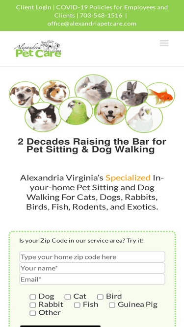 68%Alexandria Pet Care respects your privacy and we never share your information outside our company. Call or email Alexandria Pet Care today to schedule in-your-home pet sits, puppy care, or dog walks. We're a fully trained and insured team of professional neighborhood pet sitters.