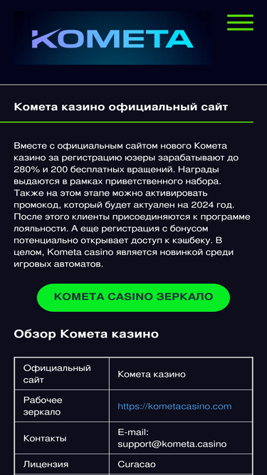 79%Вход на официальный сайт Комета казино через зеркало. Играйте в Kometa casino и получайте бонусы на депозит, промокод BAR, быстрая регистрация.