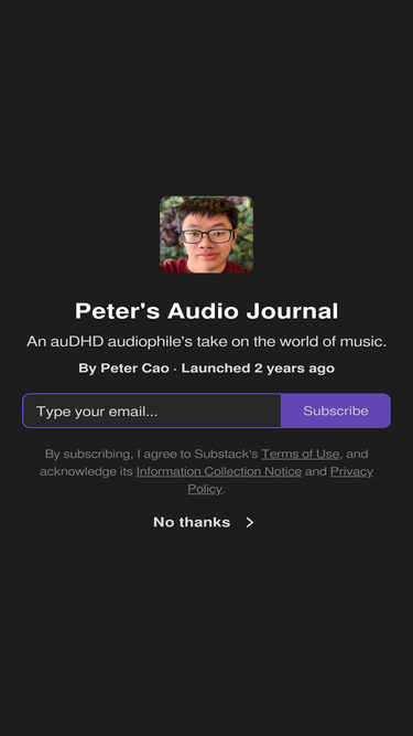 88%An auDHD audiophile's take on the world of music. Click to read Peter's Audio Journal, by Peter Cao, a Substack publication with hundreds of subscribers.