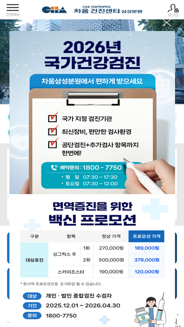 76%강남구 삼성동 위치, 종합건강검진 (암정밀, 뇌정밀, 심장정밀, 치매특화), 공단검진, 가정의학과 진료. 개인별 방사선 피폭량 측정 및 관리, 이상 징후 발견시 차병원 연계 진료