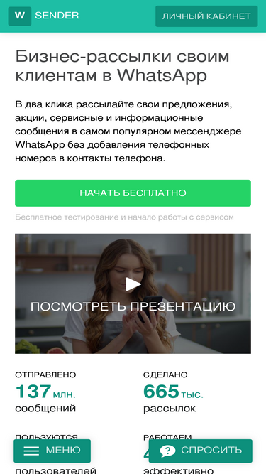 облачный сервис массовой отправки бизнес-рассылок с ватсап по своей клиентской базе без сохранения номера. рассылайте в мессенджере whatsapp сообщения с текстом, картинками, видео, файлами или карточкой контакта с любых ваших номеров без добавления в контакты смартфона.