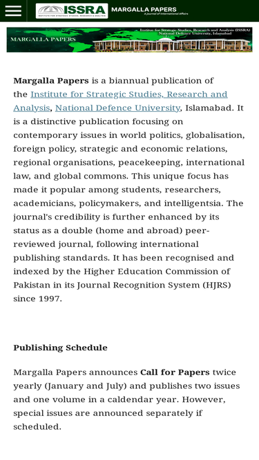 96%margalla papers is a biannual publication of the national defence university, the premier institution for security and strategic studies. the journal is a unique publication of the country, which primarily deals with issues related to contemporary world politics, globalization, foreign policy, strategic and economic relationships, regional organizations, un peacekeeping operations, international law, and global commons. the journal has its standing among the students, researchers, experts, policymakers, and intelligentsia. keeping the flag high, all the research papers appearing in the journal are selected after rigorous scrutiny and blind peer reviews at home and abroad. it is duly recognized by the higher education commission of pakistan. the journal is being published regularly since 1997.