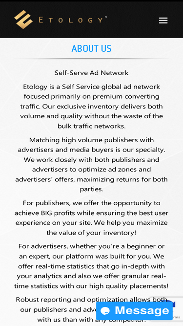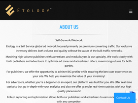 about us etology is an invite only global ad network focused primarily on premium converting members area traffic. our exclusive inventory delivers both volume and quality without the waste of the bulk traffic networks. matching high volume publishers with advertisers and media buyers is our specialty. we work closely with both publishers and advertisers to optimize