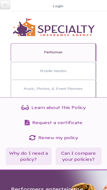 specialty insurance agency is a boutique insurance agency servicing performers and vendors across the united states. liability policies: performer insurance, vendor insurance, food truck insurance and more.