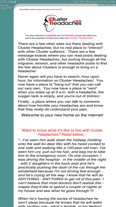 100%cluster headaches and those that suffer, join the cluster headaches worldwide support group! this site is devoted completely and exclusively to those that suffer from cluster headaches