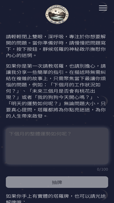 95%無論你心中有何疑惑,或是迷失在未知的未來中,光途塔羅樂意成為你的良善夥伴。透過問題解牌,我們期待著為你提供溫暖、啟發與指引,共同揭開生命旅程中的各種迷霧,找到那份心靈的平靜。