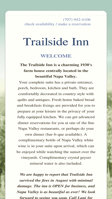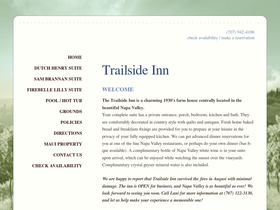 100%the trailside inn is a charming 1930's farm house bed and breakfast centrally located in the beautiful napa valley in calistoga california.