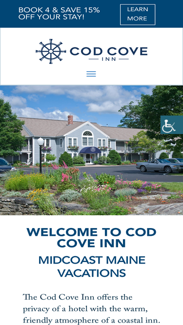 74%Midcoast Maine's Cod Cove Inn offers the privacy of a hotel with the warm, friendly atmosphere of an inn. Relax and enjoy the sunset from your private balcony or patio.