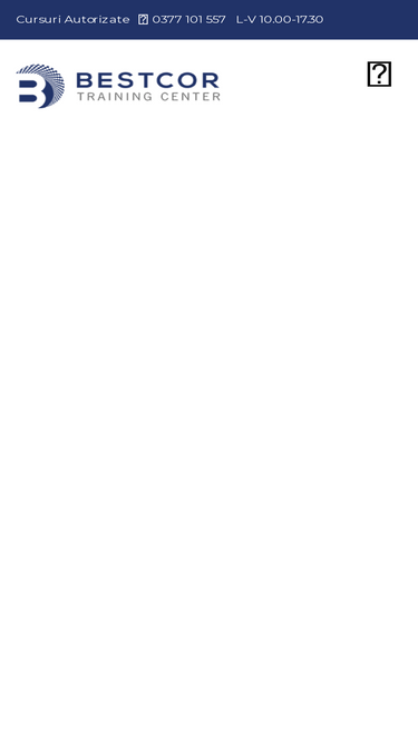 67%Contact Bestcor Training Center - Date de contact Tel : 021 315 20 20 Mobil : 0744660448 Adresa : Bucuresti, Sos. Mihai Bravu, Nr. 223, Optidol Center, Parter, Sector 3 Program de lucru : L – V 10.00 – 17.30 Email : contact@bestcor.ro Bestcor Training Center SRL Cod Fiscal: 32579513