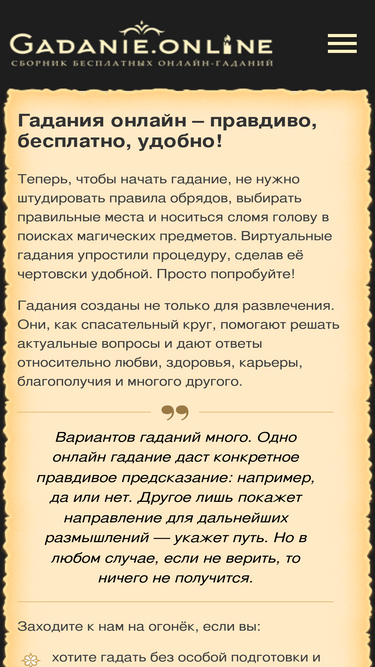 92%все гадания онлайн бесплатно. виртуальные гадания: книга перемен ицзин, книга судеб, гибрид книги судеб, таро, руны, маджонг, карты, тибетское гадание мо. книжные гадания. всемирное гадание. быстрые гадания с онлайн статистикой. звездный оракул. гороскопы персональные, гороскопы совместимости. гороскоп на сегодня, завтра, месяц, 2021 год. все виды восточных и зодиакальныех гороскопов бесплатно. гороскоп майя, славян, квадрат пифагора. все сонники. нумерология. равных в инете нет!!!