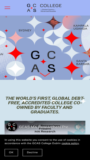 87%Frequently Asked Questions Find answers to common questions about admissions, programs, accreditation, and the GCAS experience. About GCAS What is GCAS? GCAS (The Global Center for Advanced Studies) College Dublin is the world’s first debt-free college offering EU-accredited degrees that is co-owned by faculty, staff, and graduates. Founded in 2013, we offer accredited BA, MA, […]