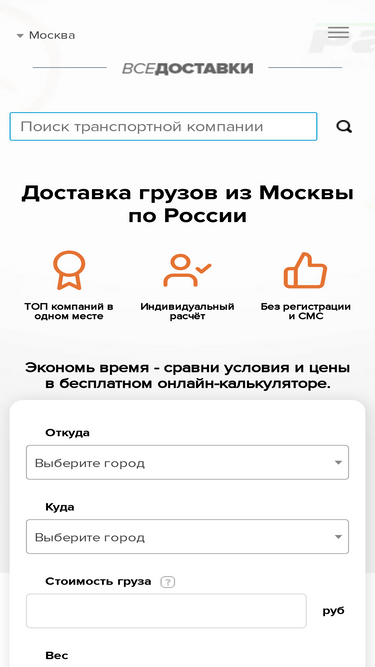 95%Доставка грузов в любой город России из Москвы. Калькулятор расчета стоимости грузоперевозки разных транспортных компаний.