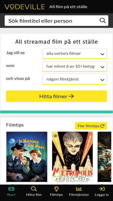 89%Sök efter film hos alla filmtjänster på ett ställe. Med Vodeville hittar du vem som visar din film och får tips på filmer du inte visste att du vill se.