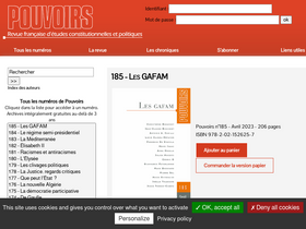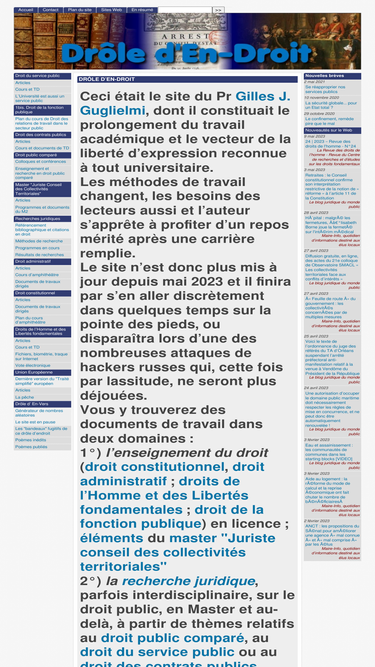 83%ceci était le site du pr gilles j. guglielmi, dont il constituait le prolongement du travail académique et le vecteur de la liberté d'expression reconnue à tout universitaire. les méthodes de travail changent, les besoins des lecteurs aussi et l'auteur s'apprête à profiter d'un repos mérité après une carrière remplie. le site n'est donc plus mis à jour depuis mai 2023 et il finira par s'en aller discrètement dans quelques temps sur la pointe des pieds, ou disparaîtra lors d'une des nombreuses attaques de hackers russes qui, cette fois par lassitude, ne seront plus déjouées. vous y trouverez des documents de travail dans deux domaines : 1°) l'enseignement du droit (droit constitutionnel, droit administratif ; droits de l'homme et des libertés fondamentales ; droit de la fonction publique) en licence ; éléments du master "juriste conseil des collectivités territoriales" 2°) la recherche juridique, parfois interdisciplinaire, sur le droit public, en master et au-delà, à partir de thèmes relatifs au droit public comparé, au droit du service public ou au droit des contrats publics. issn 2495-8875. bonne visite à tous !